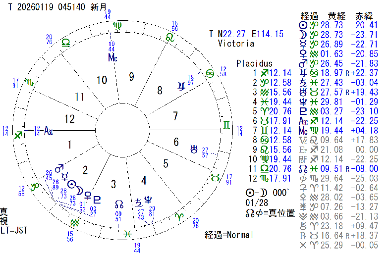 2026年1月19日〜2026年2月16日 ![]() 2月のマンディーン (1/19〜2/16) 本年度最初のマンディーンです。 今年もよろしくお願いいたします。 星図からは割りに暖かく、風に注意という感じになっています。 乾燥もあるでしょうし、色々とご自愛ください。 嫌なことに大量死を暗示する星の位置があります。 海外の事だと納得できますが、国内でも注意してください。 第1室(国民・方向)火星・水星・新月・金星・冥王星 企業意欲・好戦的・水商売・国民・女性労働 年の初めです。企業も個人も活力があります。若い女性の話題もあるでしょう。 第2室(予算・歳入) 第3室(通信・交通)土星・海王星 冷戦・計画犯罪・テロ 通信系の問題や、酒や、ドラッグの問題があるでしょう。 第4室(国土・農業) 第5室(教育・市場)天王星 事故・相場変動 マーケットの問題や、為替、金融に問題があるかも知れません。 第6室(雇用・サービス) 第7室(同盟国・条約)木星 有名人結婚 米国を初め、友好国の話題が増えるでしょう。 第8室(死亡・同盟国の国庫) 第9室(外国・宗教・法律) 第10室(首相・国家元首・政治) 第11室(議会) 第12室(犯罪・障害) --------------------------------------------------------------------------------------- 先月の反省 第1室(国民・方向)土星・海王星 貧困・社会主義 年末・年始 期待のわりに、生活がなんとなく充実しないのは、物価高 かも知れません。 ※ 物価高の話題は、お正月であまりありませんでした。 ※ 中国がレアアースの輸出を制限したことからチョット警戒が必要ですね。 ※ 南鳥島の海底の泥を採取して、レアアースを手に入れるという話で、探査船が出港しました。 ※ はずれとします。 第2室(予算・歳入) 第3室(通信・交通)天王星 作家死亡 お金の話とか、経済とかでの話とか、もしくは絵本作家とかの帰星が あるかも知れません。 ※ 作家ではありませんが、久米 宏(80)氏が帰星しました。 ※ 雪の為、高速自動車道路で事故が起こっています。 ※ 交通の事で障害が多発しています。 ※ あたりとします。 第4室(国土・農業) 第5室(教育・市場)木星 教育・宗教問題 家庭における宗教・信仰の話で話題になることが有るかもしれません。 日本における動物園のパンダがいなくなるようです。 ※ トランプさんや高市首相の暴走で株価は最高値を見せました。 ※ 立憲民主党と公明党は新党を樹立するらしいです。 ※ あたりとします。 第6室(雇用・サービス) 第7室(同盟国・条約) 第8室(死亡・同盟国の国庫) 第9室(外国・宗教・法律)水星 出版・民事訴訟 統一教会などに対する民事訴訟が話題になるかも知れません。 ※ 米国がベネゼイラから大統領を拉致し拘束し、裁判にかけるという事件がありました。 ベネゼイラの運営を米国が一時的に担うと宣言しています。 ※ 米国はグリンランドの購入も宣言しました。 ※ 力の裏づけがない国際法の頼りなさが露見されます。 ※ あたりとします。 第10室(首相・国家元首・政治)金星・新月・火星 皇室の喜び事・政府・戦争・内戦・クーデター 年の初めには、各界のトップの話題が考えられます。 ※ なんといっても、高市早苗総理の衆議院解散の話題とそれに伴い、株価が上昇したことです。 ※ イランで抗議デモが起こり、犠牲者が3000人に上ったようです。 ※ 新年早々、地震の警戒・警報が流れました。 ※ 山梨県で山火事が発生して、いまだ鎮火していません。 ※ あたりとします。 第11室(議会) 第12室(犯罪・障害)冥王星 凶悪犯罪増加 コンピューター犯罪に注意しましょう。 ※ 物件のさし押さえに、おと連れた裁判所執行官と関係者が刺されて帰星する事件がありました。 ※ 会社社長・会長に成りすますメールを使っての犯罪が起きています。 ※ コンピューターウイルスによる販売減少により、アサヒビールの売り上げが年間で2割も落ちたという事です。 ※ あたりとします。 今年も始まりました。 お正月は、のんびりと過ごせましたか? 海外では、トランプ大統領が大活躍で、ベネゼィラの現職大統領・夫人を拉致し米国で裁判を受けさせるという行為がありました。 昔、日本で金大中氏を拉致されるという、自国の警察権を侵害される事件でした。 日本も、早々に衆議院の解散選挙が行われるらしいです。