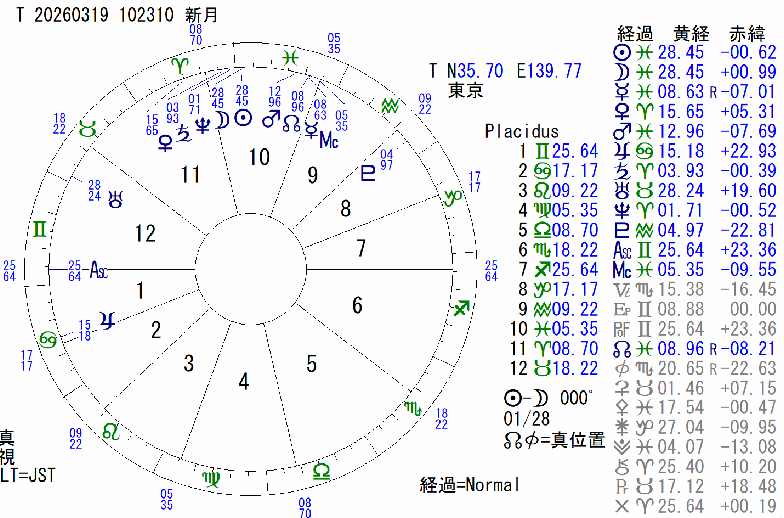 2026年3月19日〜2026年4月16日 ![]() 4月のマンディーン (3/19〜4/16) 段々と暖かくなってきて、もうすぐ桜の開花が始まり、桜前線が日ごとに北上してくると思います。 ついに米国はイランと戦争を始めてしまいました。 冥王星のみずがめ座イングレスの影響を考えると、米国か中国が戦争を起こし、都市が破壊される事は考えられたことですが、まだ始まったところで益々ひどくなると考えます。火に油という事もあるので、煽るようなことは止めましょう。 石油の値段が上がると、ビールとかお酒の値段も上がるのかと心配でありますが、桜とお酒を楽しみましょう。 第1室(国民・方向)木星 国家威信 米国が戦争を始めてしまい、日本の立場も微妙ですが、高市早苗総理は、 後世に恥を残さない決断をするでしょう。 第2室(予算・歳入) 第3室(通信・交通) 第4室(国土・農業) 第5室(教育・市場) 第6室(雇用・サービス) 第7室(同盟国・条約) 第8室(死亡・同盟国の国庫)冥王星 事故・火災・突然死 今月も原発を含めて、電気火災・事故・停電などに注意しましょう。 ちょくちょく地震が起きています。 大きな地震にも備えてください。 第9室(外国・宗教・法律) 第10室(首相・国家元首・政治)水星・火星・新月・海王星・土星 皇族旅行・戦争・内戦・クーデター・政府・社会主義拡大 スキャンダル・失敗・不幸 日本が派兵するか否かで、大もめにもめるでしょう。 誰も、無責任に言えないので、二転三転する可能性があります。 影響が大きいのがリーダーたちです。 第11室(議会) 金星 消費・芸術 女性議員の意見が注目されます。 派兵に賛成でも反対でも批判されるでしょう。 第12室(犯罪・障害)天王星 事件多発 インターネット上の活動・犯罪が厳しく取り締まられ、犯罪者が増える 可能性があります。 ---------------------------------------------------------------------------------------------------- 先月の反省 第1室(国民・方向) 第2室(予算・歳入) 第3室(通信・交通) 第4室(国土・農業)冥王星 交通機関・事故 飛行機や、原子力発電所のトラブルがあるかも知れません。 国土の安全・防災の問題に気を付けましょう。 ※ 再起動の原発ですが、止まったりしています。 ※ 信号無視で事故を起こし、帰星者を出してしまった人が話題になりました。 ※ 停電事故で電車が止まるという事がありました。 ※ あたりとします。 第5室(教育・市場)火星・新月・金星・水星 俳優不幸・出産率増加・遊び増加・訴訟 マーケットの変化が考えられます。 ※ 石油の価格が高騰しています。 ※ 株式市場は乱高下しました。 ※ イランとの戦争でホルムズ海峡をめぐって、通行ができなくなっています。 ※ 冬季オリンピックは終了しました。 冬季のメダルは最大でした。 ※ 日本チームは、WBCの前半は全勝でしたが、準々決勝で敗退しました。 ※ 「ローマの休日」のオードリーヘップバーン・「エースをねらえ」のお蝶夫人、「銀河鉄道999」のメーテル役の声優、池田昌子さんが帰星しました。 ※ あたりとします。 第6室(雇用・サービス)土星・海王星 紛争・雇用問題・悪習慣拡大・軍スキャンダル 人手不足とか、働き手の問題や、流行病などの問題がありそうです。 特に病気には、初めとか開始の暗示があるので、結果が現れるのがだいぶ先の 可能性があります。 ※ コロナもインフルエンザも流行しているみたいです。 ※ 保留します。 第7室(同盟国・条約) 第8室(死亡・同盟国の国庫)天王星 突然死・変死 建物等の倒壊などの事故があるかも知れません。 病気にも注意です。 ※ 大阪で、地中より直径3.6メートルの土管が地上13メートルまで突出する事件がありました。 ※ 米国内では、イスラエル関係の集会所などで銃撃事件が起きました。 ※ 高田みずえさんの旦那様・元力士・若嶋津が帰星しました。 ※ あたりとします。 第9室(外国・宗教・法律)木星 支出拡大 関税の増加があるかも知れません。 宗教の話題も考えられます。 ※ 米国は、イランの元首を爆殺し、戦闘を始めました。 在住の邦人は脱出を試みています。 ※ 統一教会に解散命令が出て、解散手続きが開始されました。教会は特別抗告に訴えましたが、執行は継続されています。 ※ あたりとします。 第10室(首相・国家元首・政治) 第11室(議会) 第12室(犯罪・障害) イタリアで冬季オリンピックが始まり、日本のモーグルとかフィギャスケートが活躍するとか、カーリングの行方を気にしていた時、米国がイランの指導者を爆殺し、戦争を始めてしまいました。 後継者にとって、父親なのですから引き下がれるわけでもなくこれからも戦闘は続くと考えます。